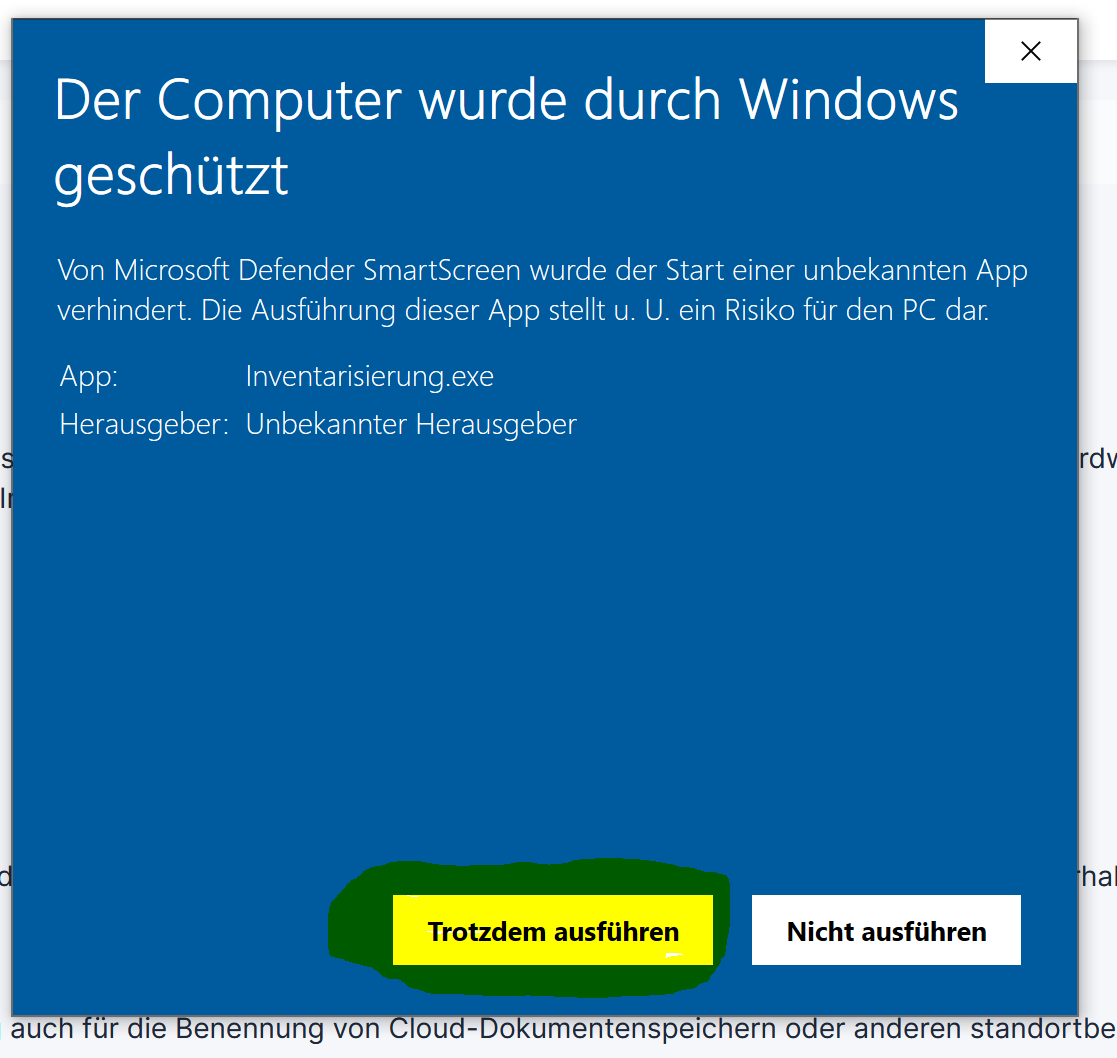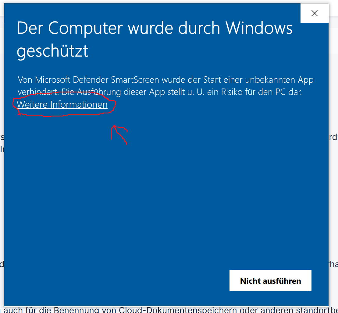 Die Smartscreenmeldung falls sie kommt muss ignoriert werden und trotzdem ausgeführt werden (Siehe Bilder)